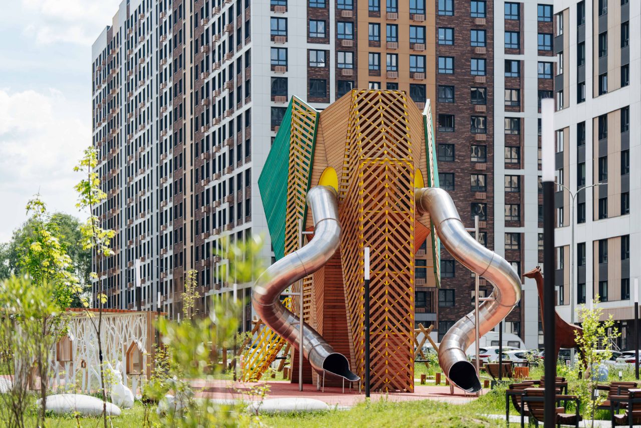 Дети окажутся в гостях у сказочных «Духов леса» — именно так называется уникальный плейхаб на территории квартала. Он разделен на зоны для малышей и ребят постарше, поэтому всем будет весело и удобно. Украшением пространства станут шалаши, внутри которых спрятаны веревочные тоннели и горки, также в плейхабе будут качалки в виде животных, домики, батуты и скалодром.